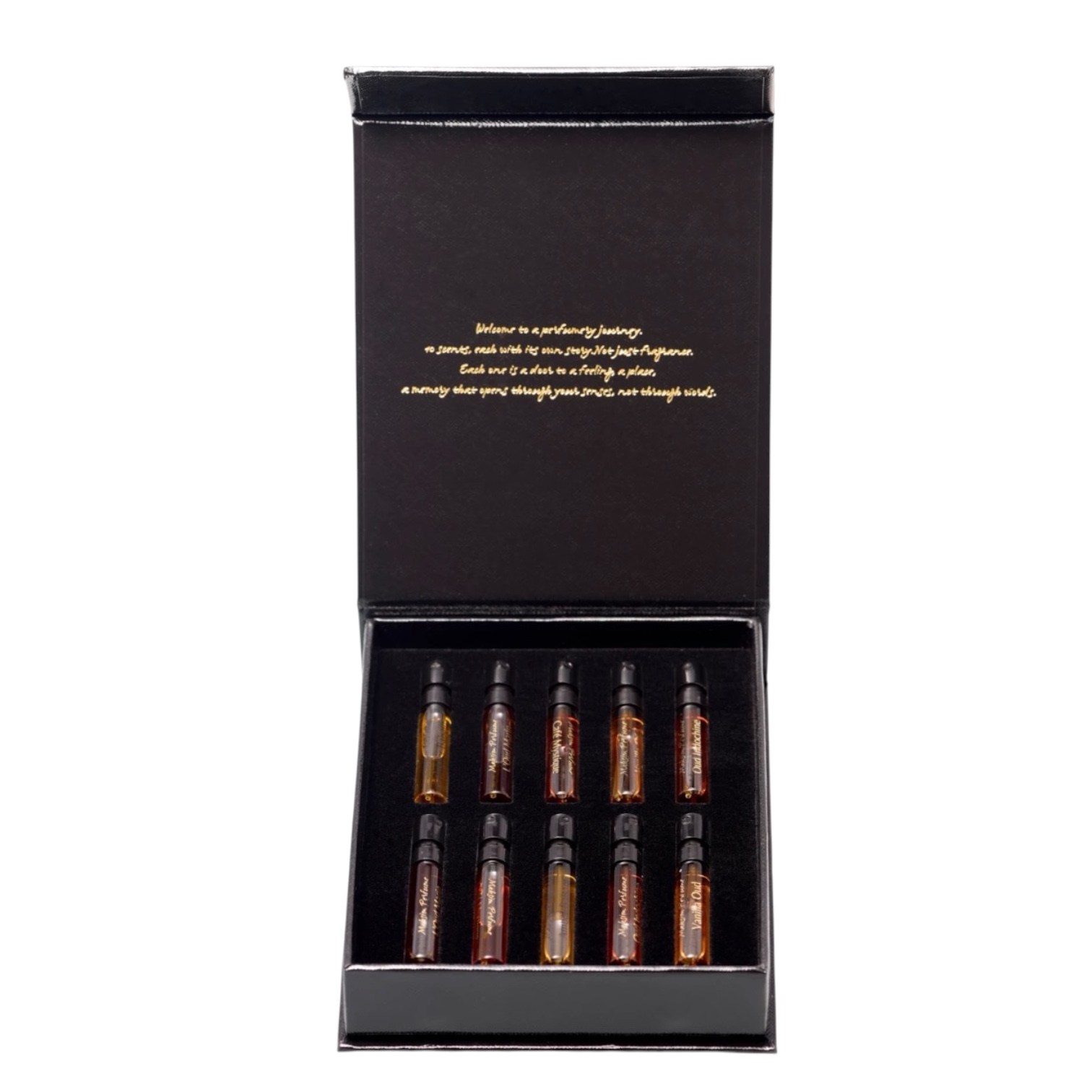 Il set include 10 flaconi da 2 ml di extrait de parfum/Eau de Parfum, un viaggio completo attraverso la nostra collezione, dalle resine profonde e dagli oud agli agrumi luminosi e ai muschi delicati.